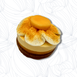 Sablé shortbread, marmelade de mangue, mousse mangue, crème de vanille, poudre de curcuma, mangue fraîche